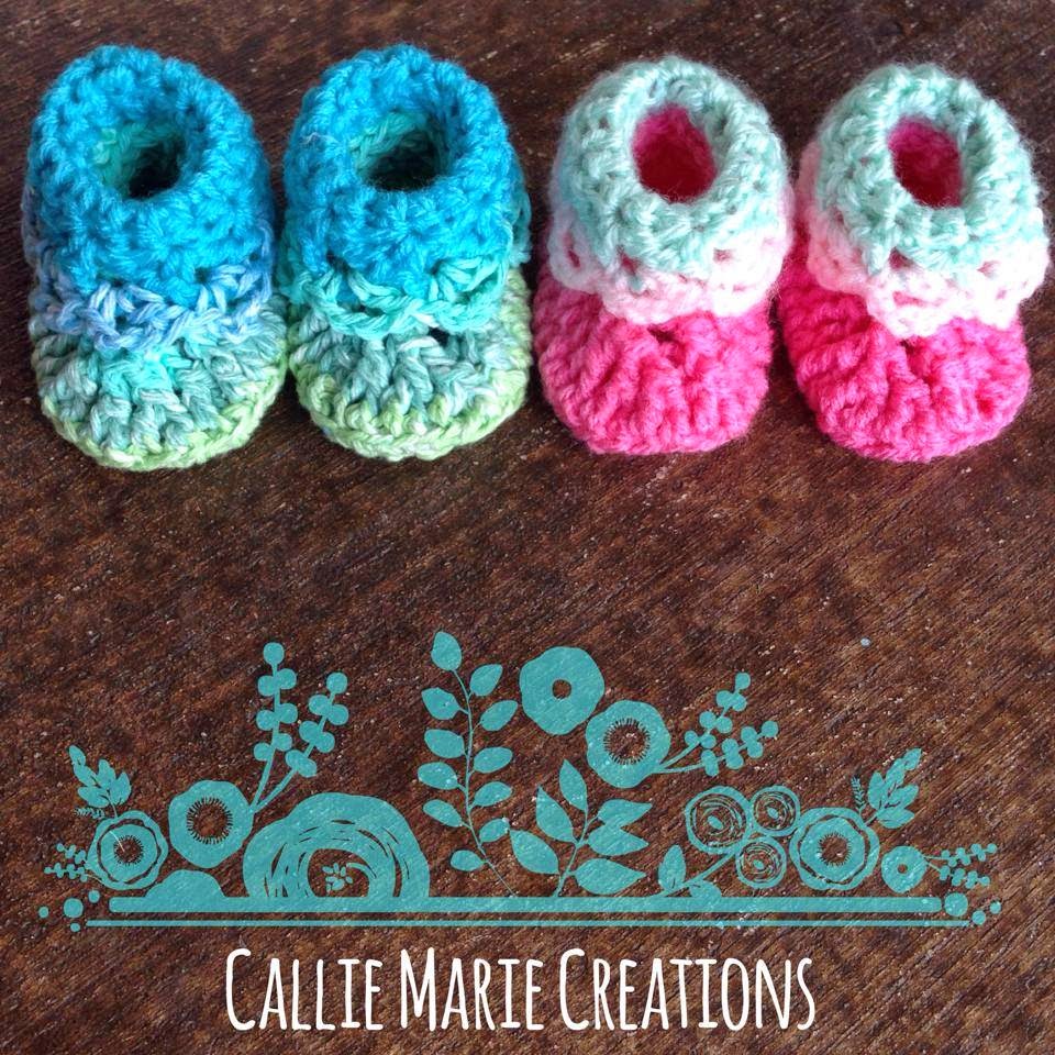 Before I go I also wanted to share these absolutely adorable creations I've been working on this week! I've been dying to order some leather moccasins for Kellan but just can't seem to justify spending the big bucks for them when I know his little chunk feet will soon be too big. SO, what is a crafty mom to do? Figure out an alternative! I found a pattern for some baby booties and LOVE how they turned out. I think they're a GREAT alternative to the moccs... for now! These are available for purchase on my Facebook Shop page if you're interested!